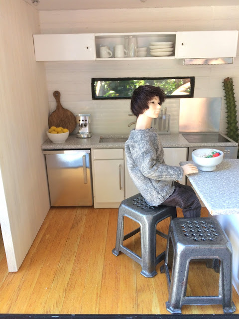The doll (Chad), is a Heidi Ott doll, dressed in clothes and shoes from Lena Kristapchuk on Etsy. The kitchen kit is ELF Miniatures, the coffee machine is also ELF, the knife block is Miniature Co, the bowl of yoghurt and fruit is Petite Boulangerie Au and the stools are My Miniature Emporium.